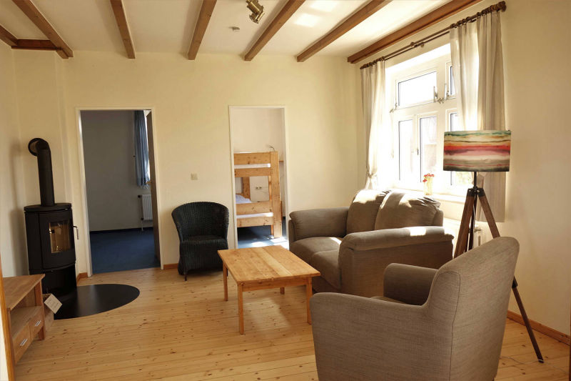 Unsere Wohnung 1 liegt im Erdgeschoss und ist mit einer Wohnfläche von 61qm für bis zu 4 Personen ausgelegt. Die Wohnung verfügt über ein Schlafzimmer mit Doppelbett und einem großen Kleiderschrank, sowie ein Schlafzimmer mit Etagenbett, ein gemütliches Wohnzimmer (TV Flachbildschirm), eine separate, voll eingerichtete Küche (u.a.Geschirrspüler,Mikrowelle,Ceranfeld) und ein Badezimmer. Das besondere Highlight dieser Wohnung ist die große Sonnenveranda, die zum Entspannen einlädt. Des Weiteren kann aus den Fenstern ein Blick auf die Baltrumer Dünen und teilweise auf das Wattenmeer genossen werden. Ein Kaminofen sorgt auch an kalten Tagen für gemütliche Stimmung.